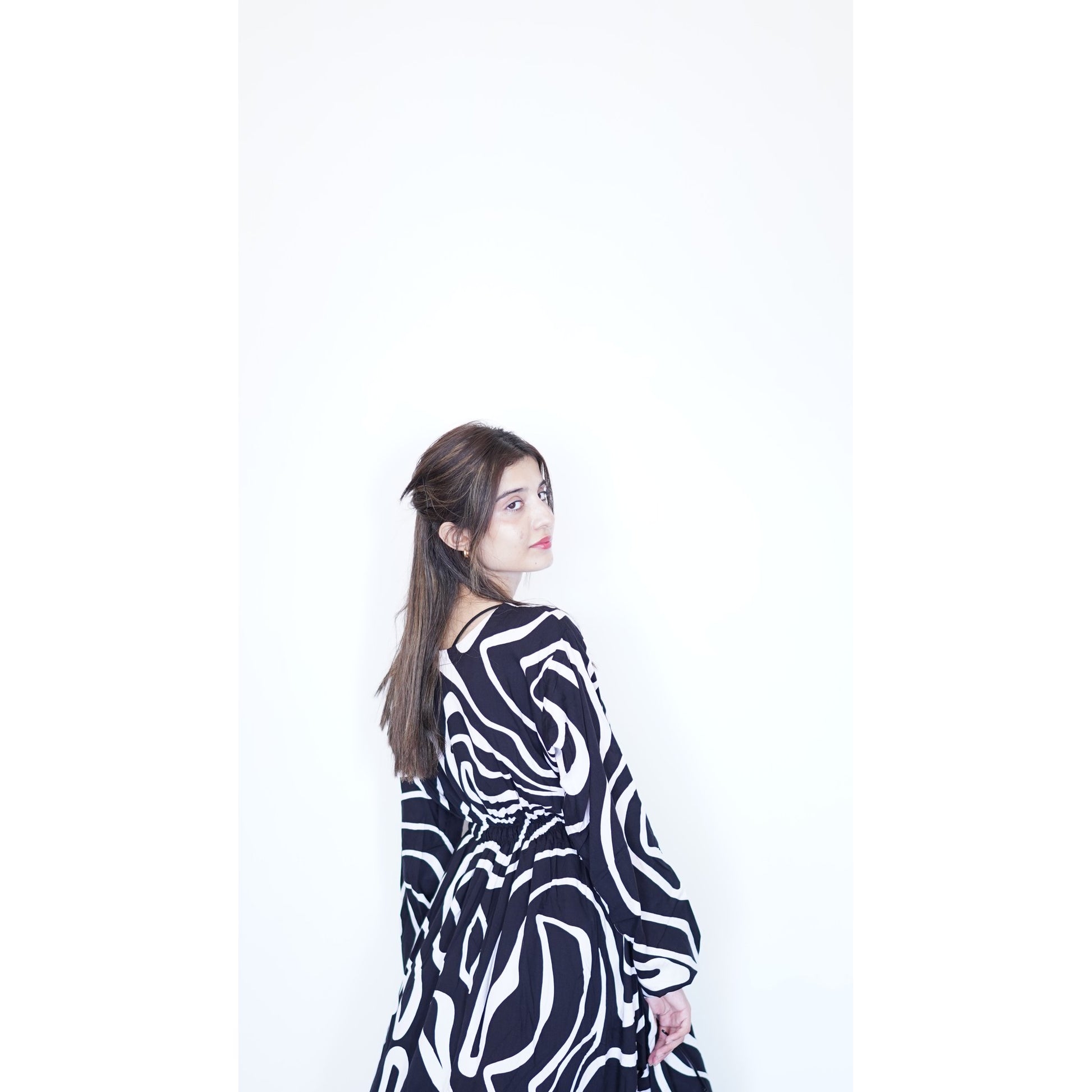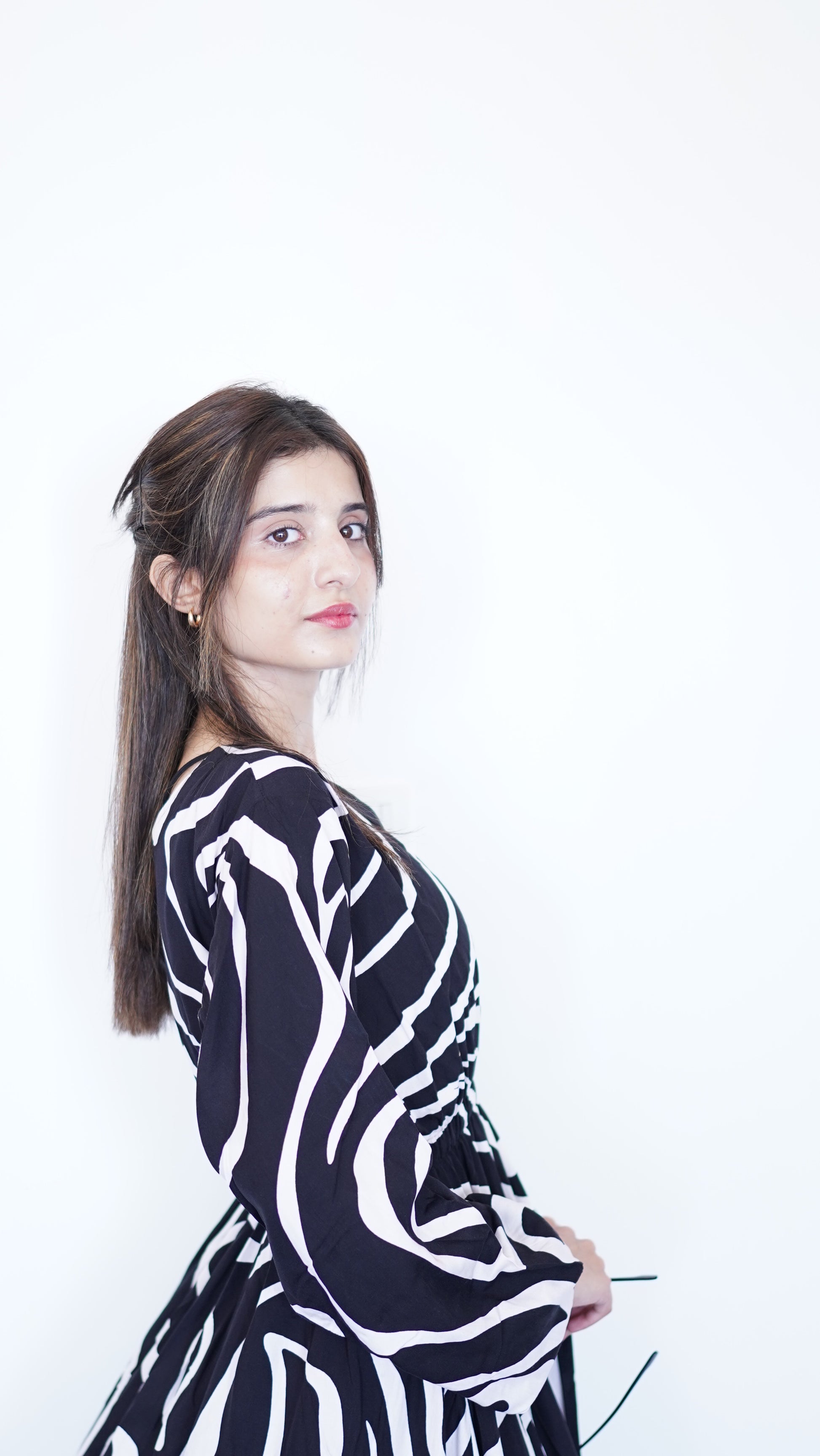 Make a bold statement in our Zebra Wave Maxi Dress a flowy, full-length dress featuring an abstract black and white swirl print. Designed with a relaxed fit, V-neckline, and puffed long sleeves, it offers both comfort and effortless style. Perfect for casual chic days or artistic evening looks.