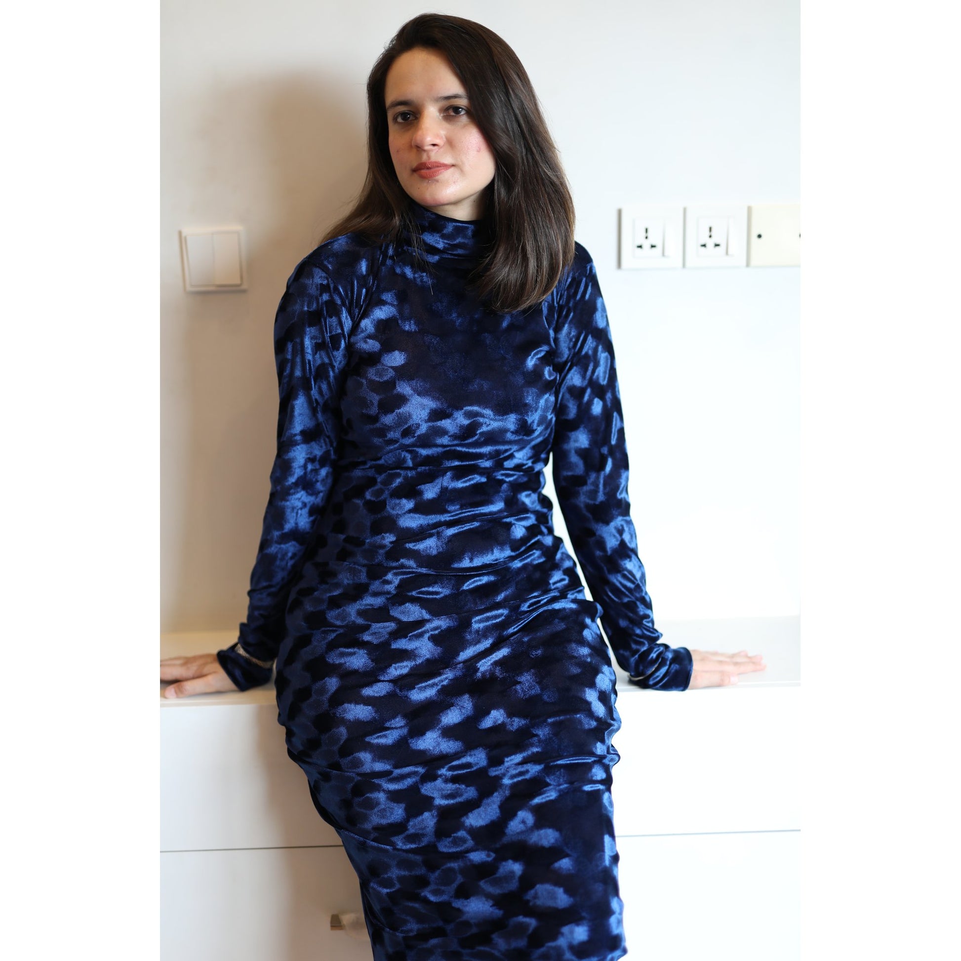 Step into elegance with the Midnight Mirage Bodycon, crafted in a luxe velvet finish with a subtle animal-inspired pattern. Its deep navy tones and figure-hugging silhouette make it the perfect blend of bold and sophisticated — ideal for evening soirées and statement moments.